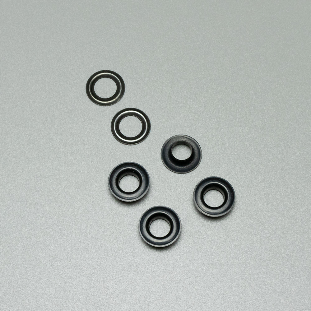 Gromets in black oxide color Paired with silver backing washers, nickel free.