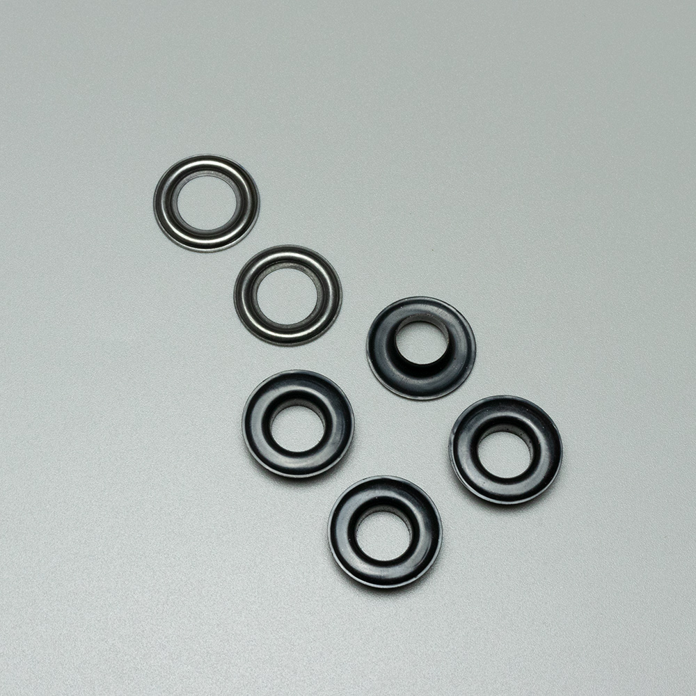 Gromets in black oxide color Paired with silver backing washers.
